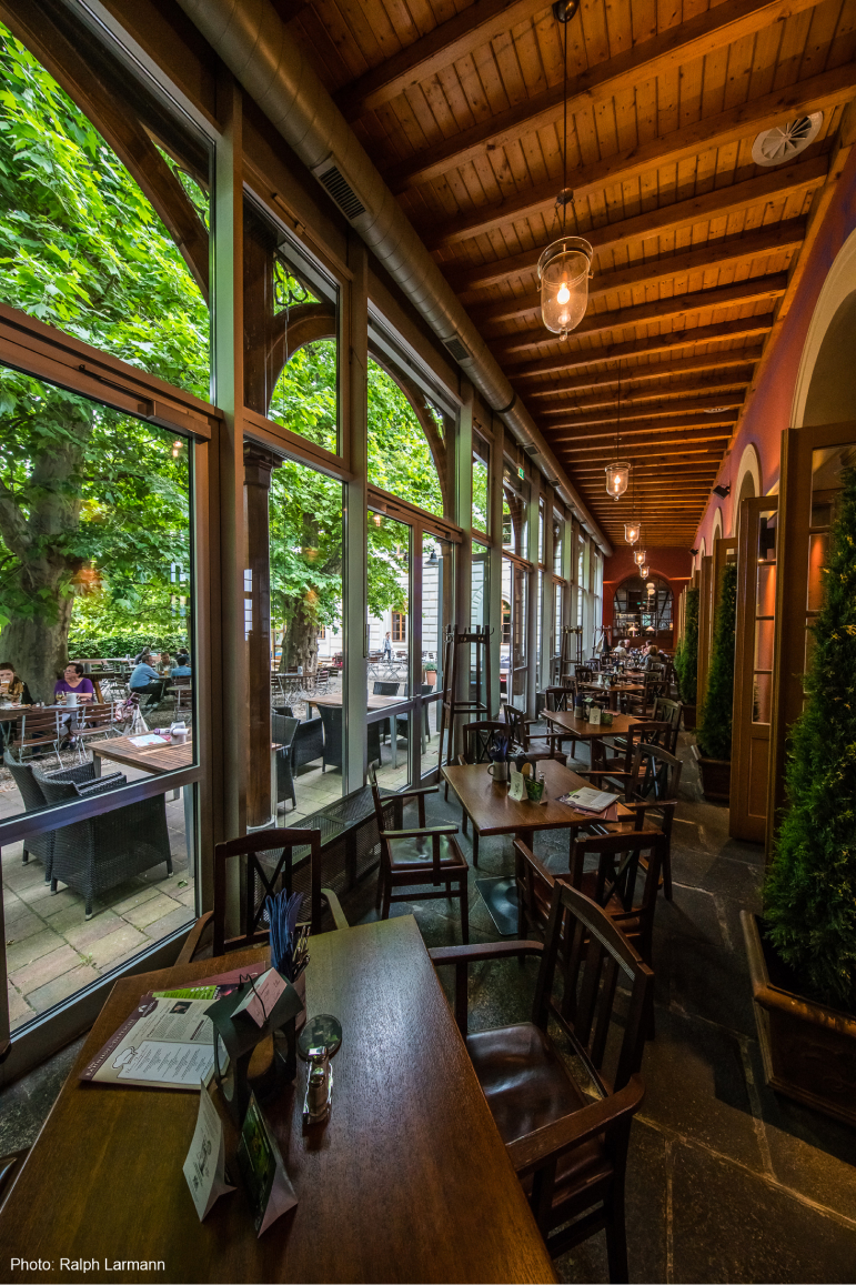 Die ursprünglich als überdachter Gang konzipierten Arkaden dienen heute mit ihren 60 m² als zusätzlicher Gastraum, dessen nachträglich eingebaute Glasfront mit Blick in den Biergarten eine Wintergarten-Atmosphäre und ein stilvolles Ambiente für Geschäftsessen oder Rendezvous bietet.